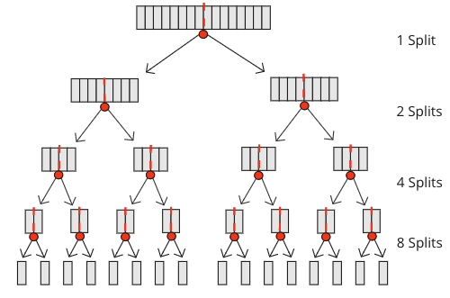 To split an array from start until the sub-arrays only consists of one value, Merge Sort does a total of \(n-1\) splits. Just imaging an array with 16 values. It is split one time into sub-arrays of length 8, split again and again, and the size of the sub-arrays reduces to 4, 2 and finally 1. The number of splits for an array of 16 elements is \(1+2+4+8=15\).