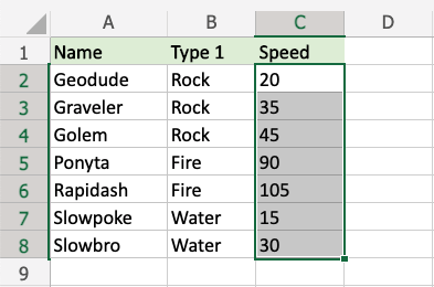 1. Select the range of Speed values C2:C8