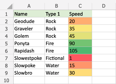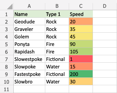 Highlight the Speed values of each Pokemon with Color Scale conditional formatting.