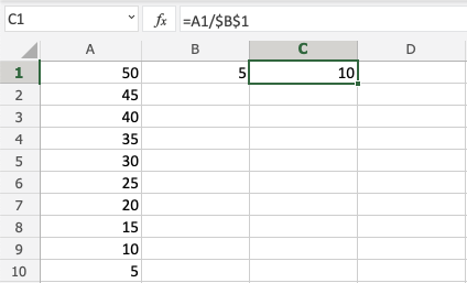 Goob job! You have successfully used absolute reference to divide B1(5) with the range A1:A10.