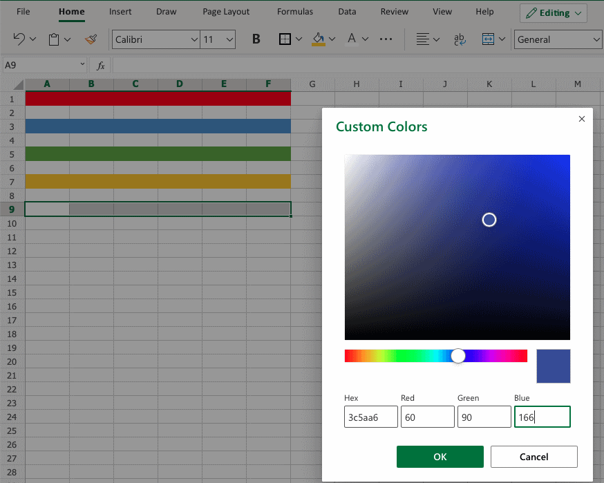 Apply RGB code 60, 90, 166 to A9:F9