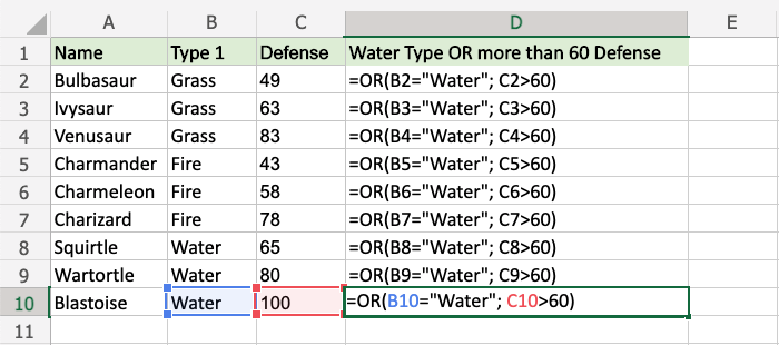 - Wartortle is both Water type and has more than 60 defense, so the function returns "TRUE"