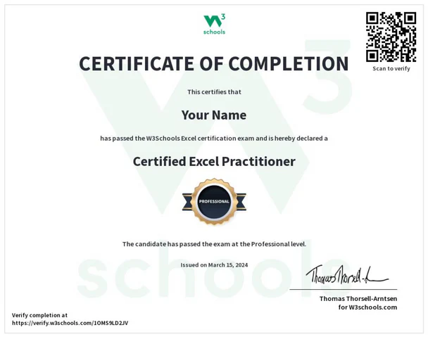 The course includes the W3Schools Certified Excel Practitioner certification.