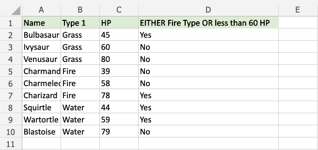 Now, each row has a check for Fire Type or HP less than 60, but not both: