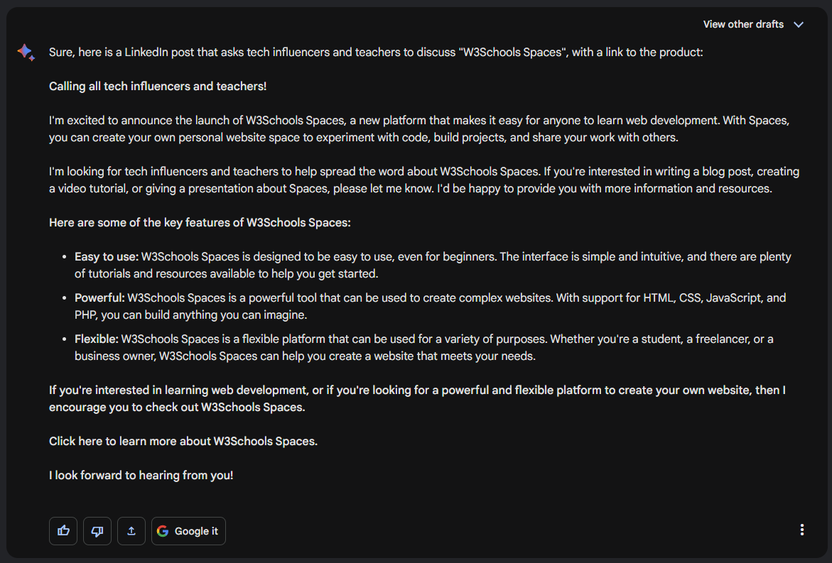 Create a LinkedIn post that asks tech influencers and teachers to discuss "W3Schools Spaces". Include a link to the product.
