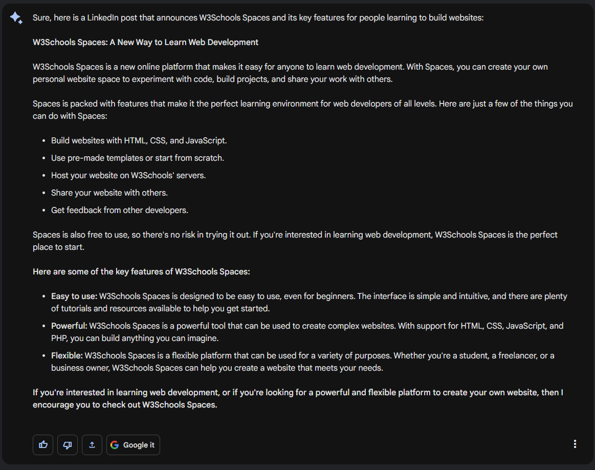 Create a LinkedIn post that announces "W3Schools Spaces" and its key features for people learning to build websites