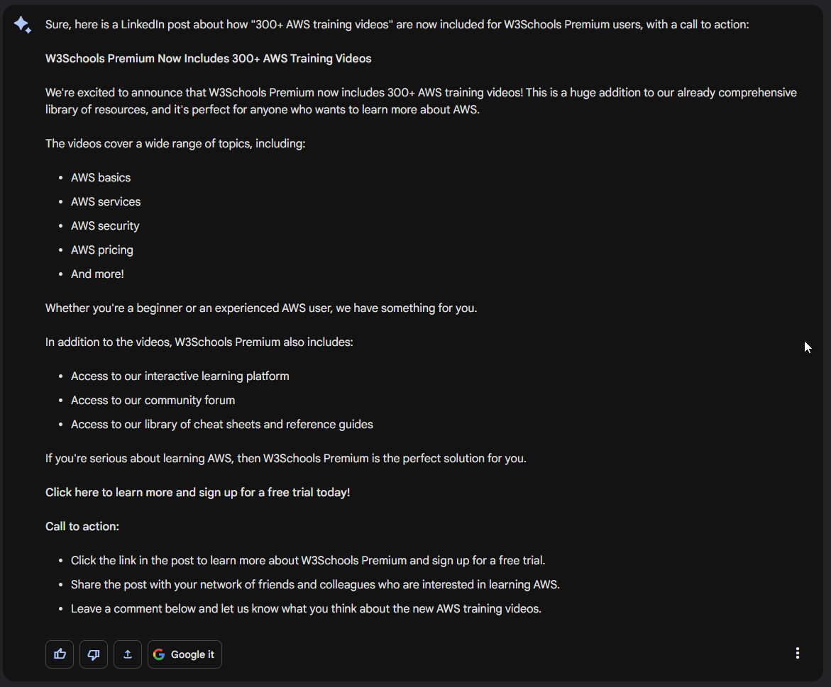 Create a LinkedIn post about how "300+ AWS training videos" are now included for W3Schools Premium users. Include a call to action.