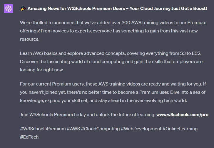 Create a Facebook post about how "300+ AWS training videos" are now included for W3Schools Premium users. Include a call to action.