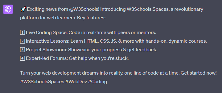 Create a Twitter post that announces "W3Schools Spaces" and its key features for people learning to build websites