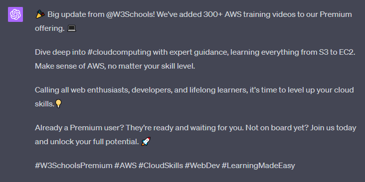 Create a Twitter post about how "300+ AWS training videos" are now included for W3Schools Premium users. Include a call to action.