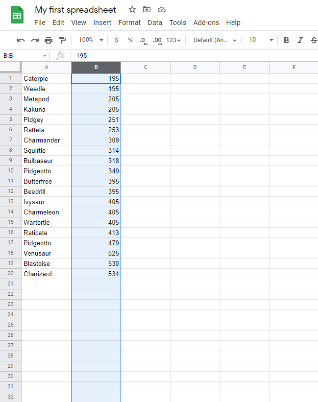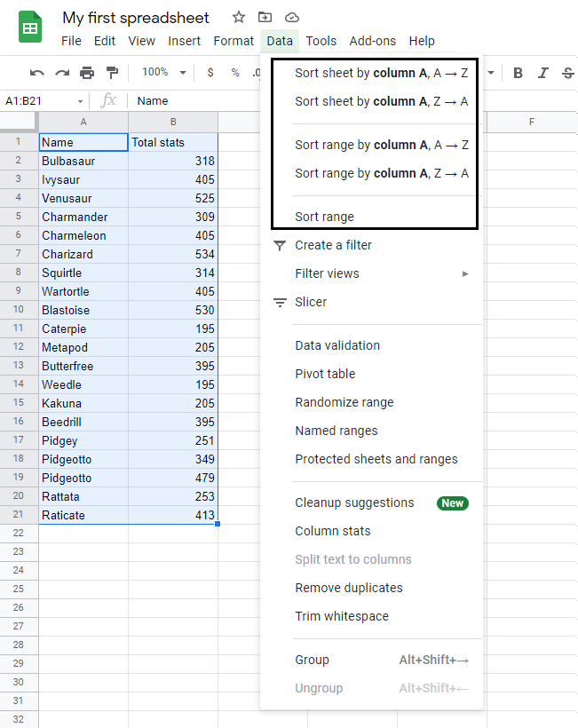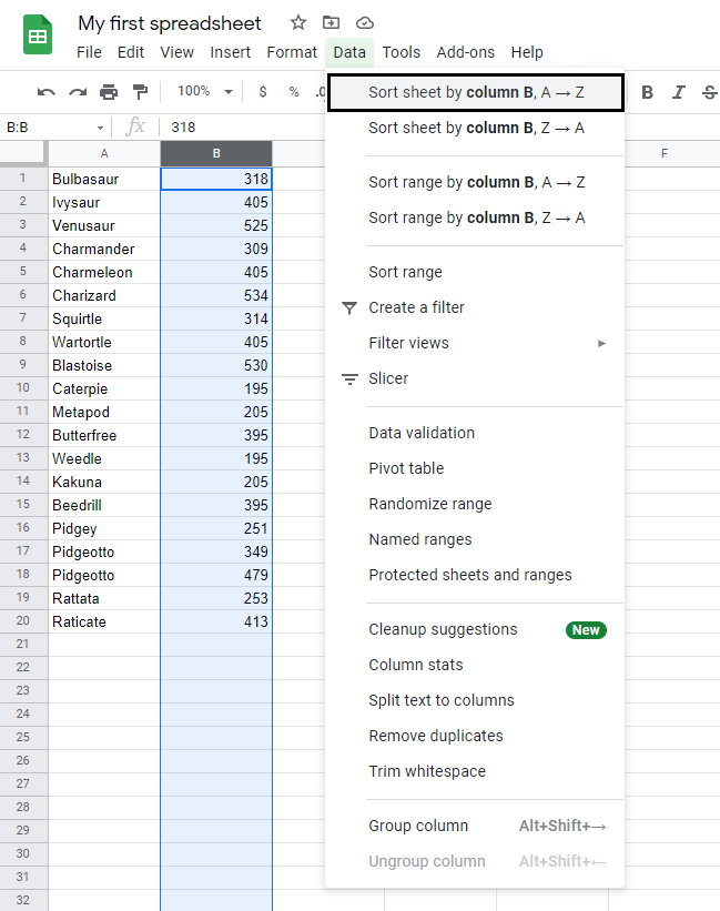 1. Click on the Data menu and select Sort sheet by column B, A → Z