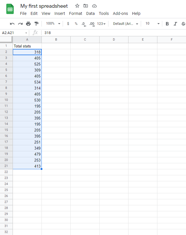 Sort the Pokemon in the range A2:A21 by their Name, ascending from smallest to largest (A-Z).