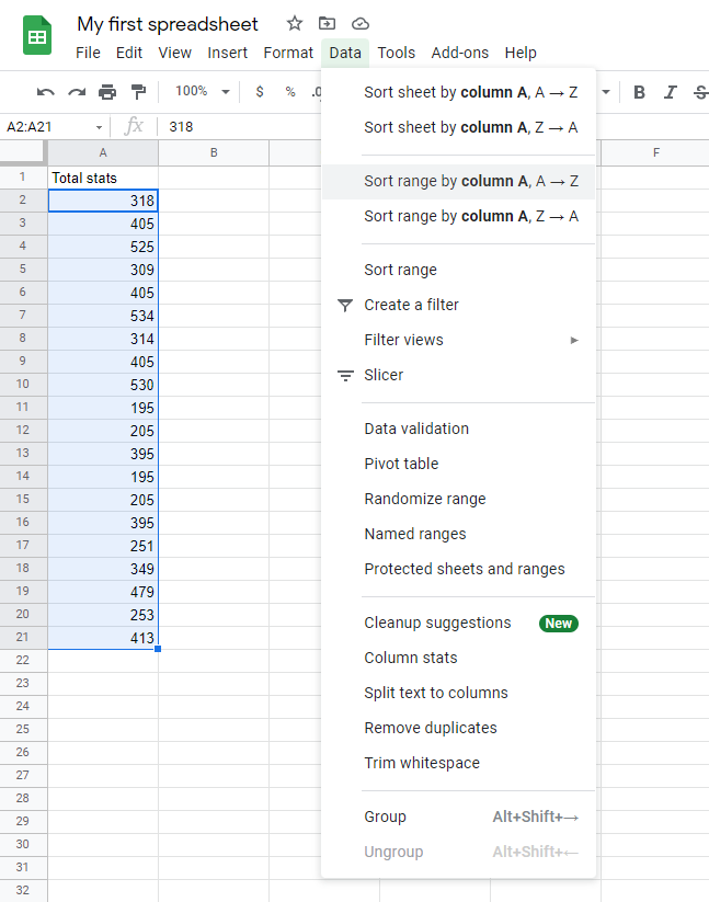 1. Click on the Data menu and select Sort range by column A, A → Z