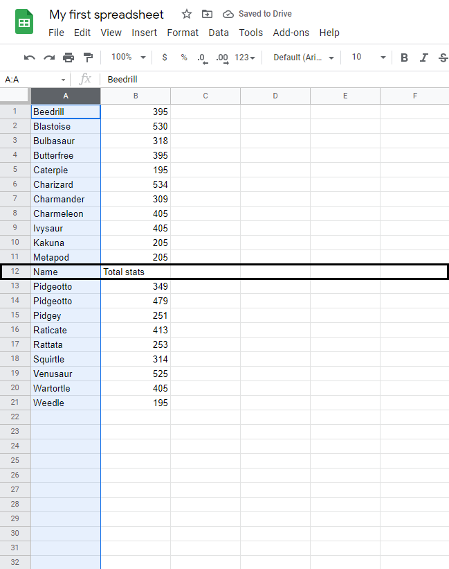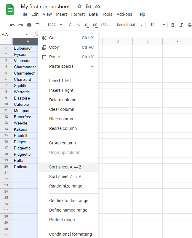 - Click on the Data menu and select Sort sheet by column A, A → Z