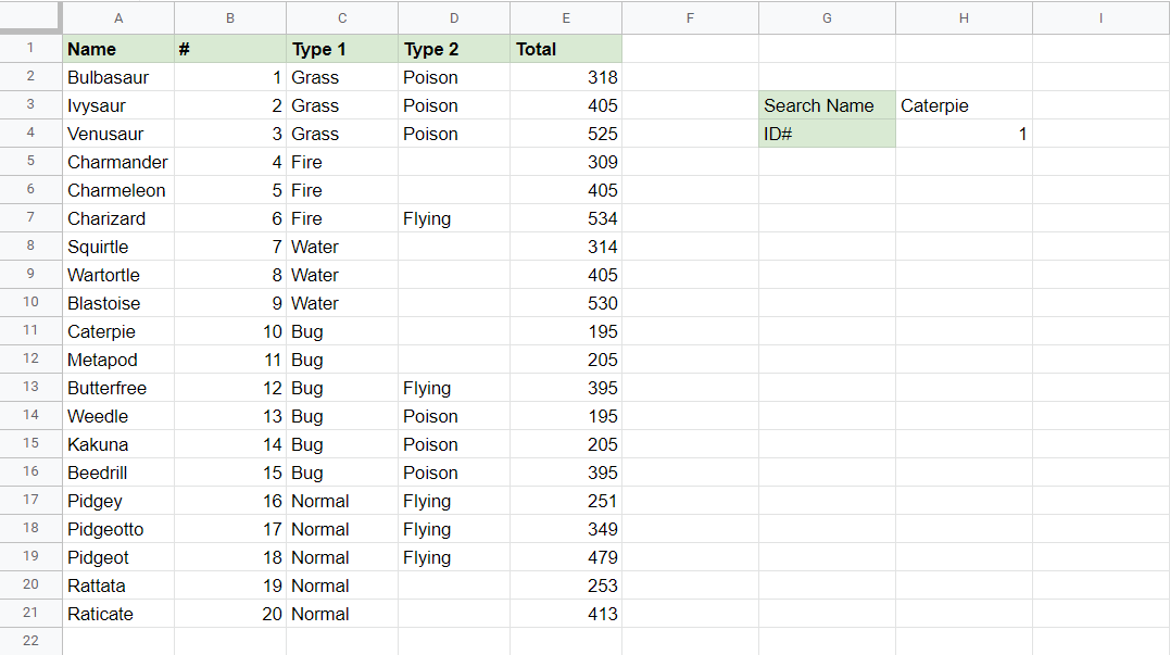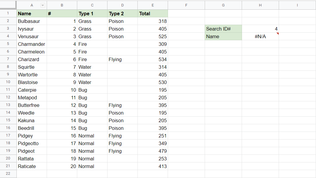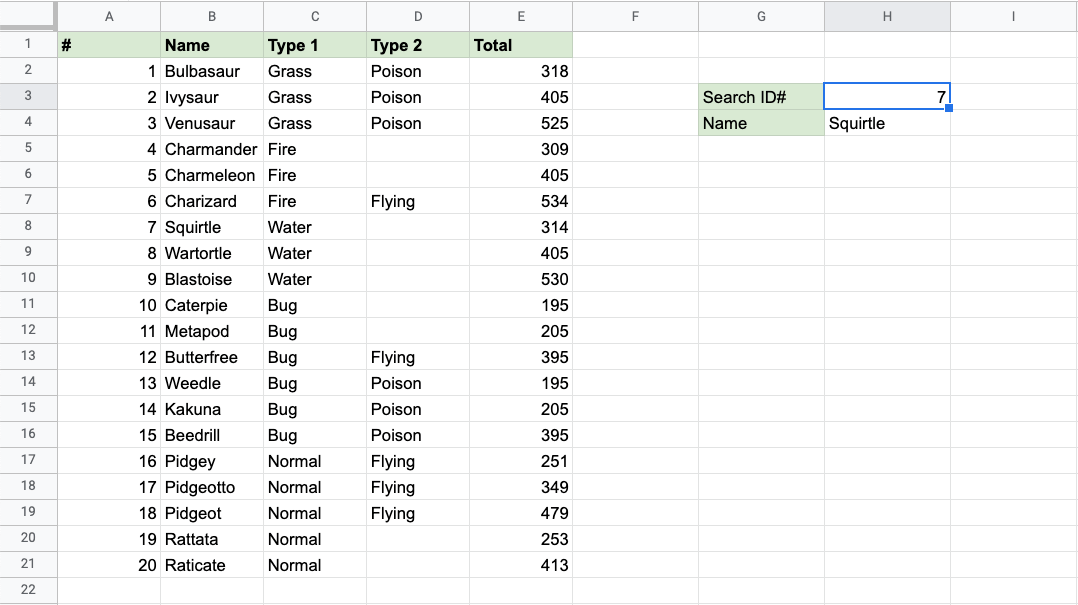 Have a look at that! The VLOOKUP function has successfully found the Pokemon Squirtle which has the ID# 7.