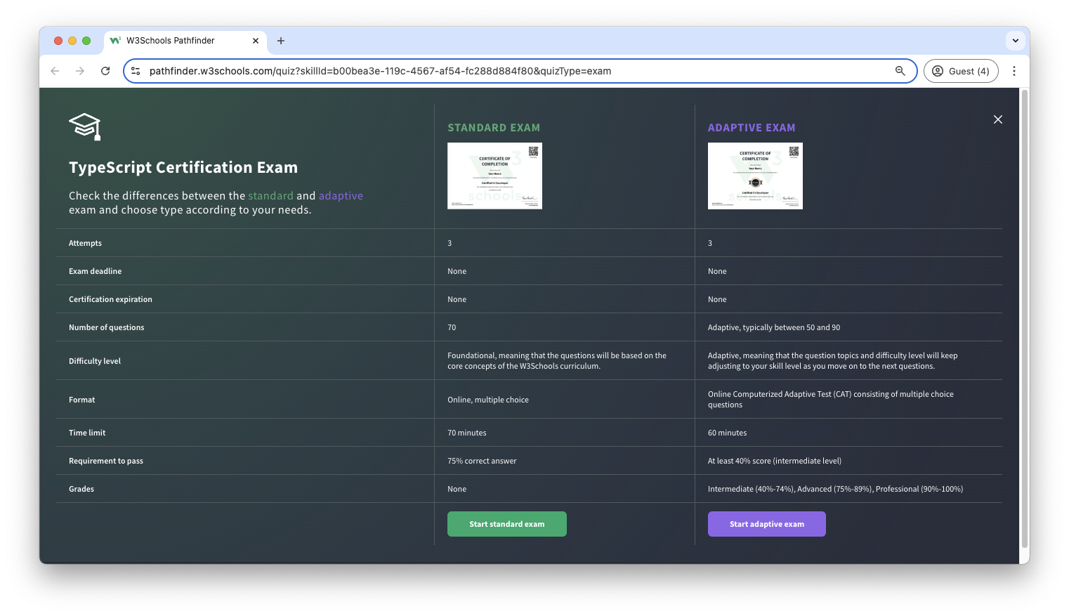 The TypeScript exam is a test that summarizes the W3Schools TypeScript syllabus.