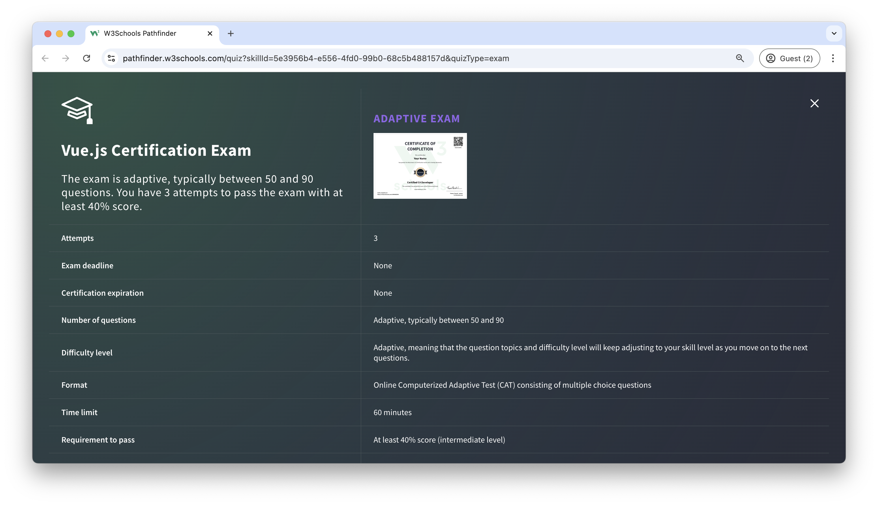 The Vue exam is a test that summarizes the W3Schools Vue syllabus.